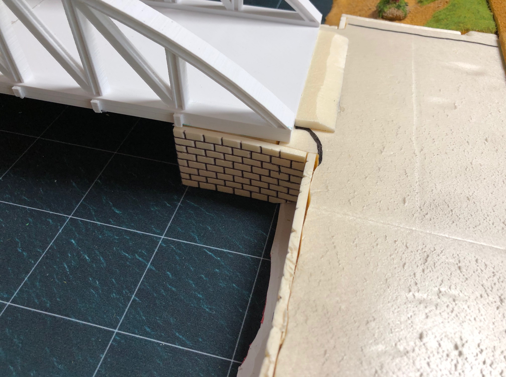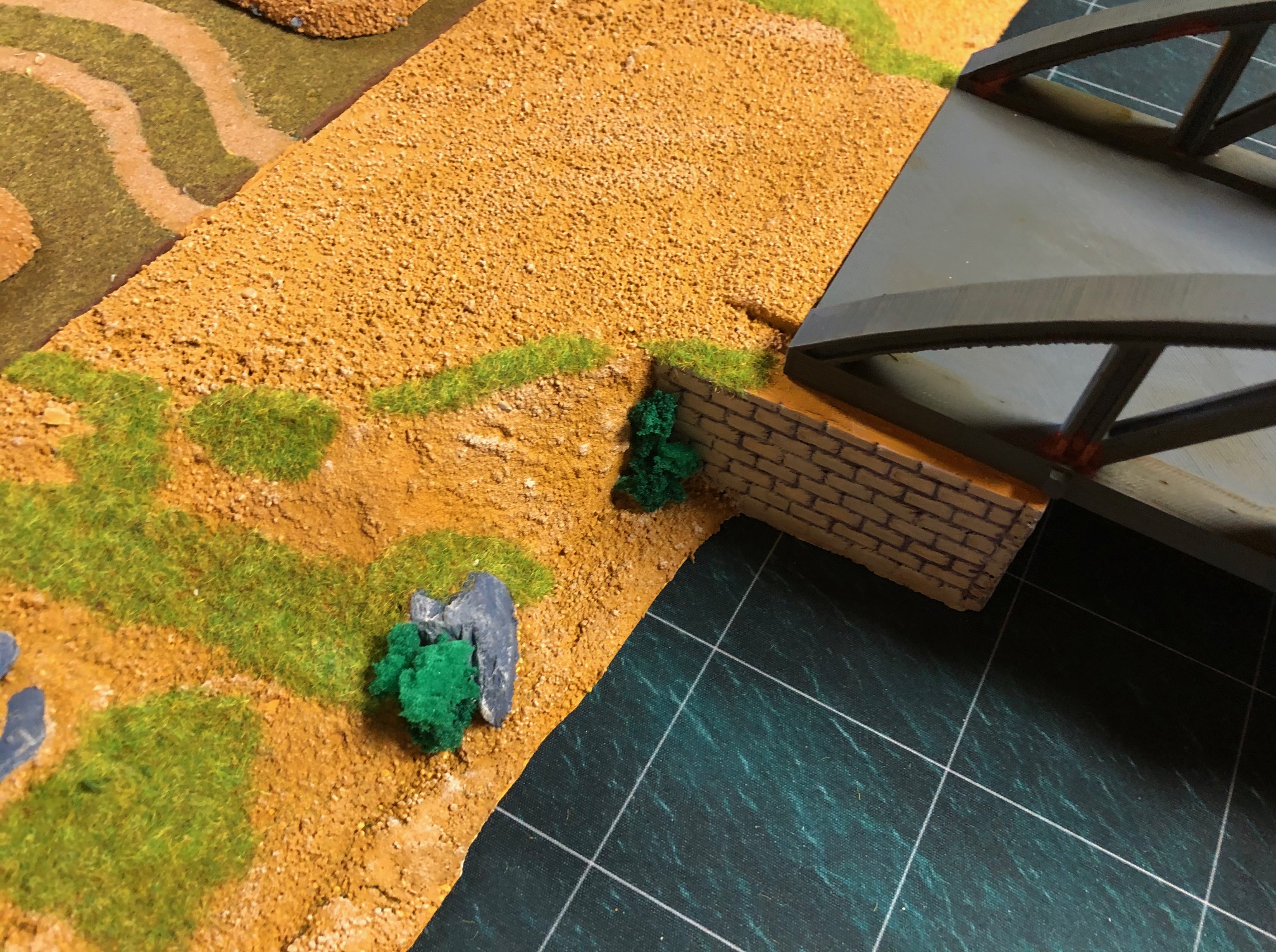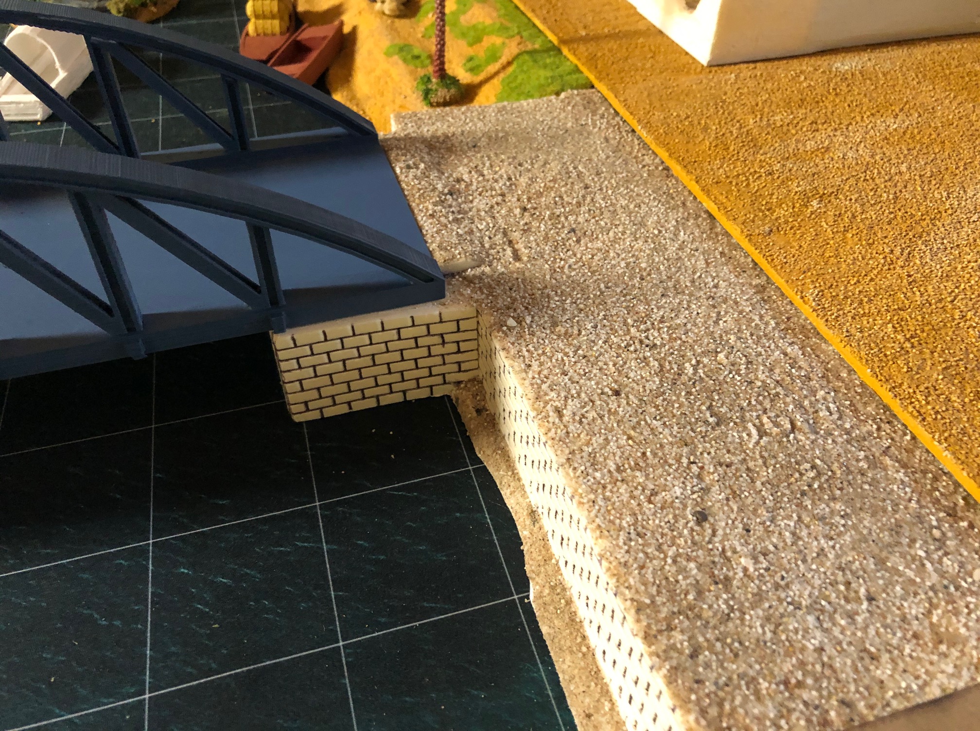As I have build new riverbanks for my wargaming terrain I needed a bridge to cross the river. First of all I needed banks for the bridge. I build theses, as I build all my terrain tiles, from extruded polystyrene sheets. The bricks are engraved into the polystyrene. I added sand and gravel painted the banks and added self-made flocking material.