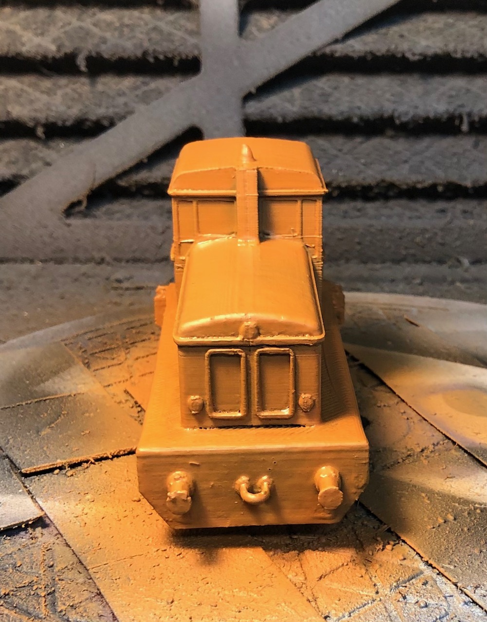 I wanted to try out the salt and hairspray method of rusting up the engine therefore I base coated the complete model in Vallejo orange brown, my base color for rust and a heavy coat of varnish to protect the base coat.