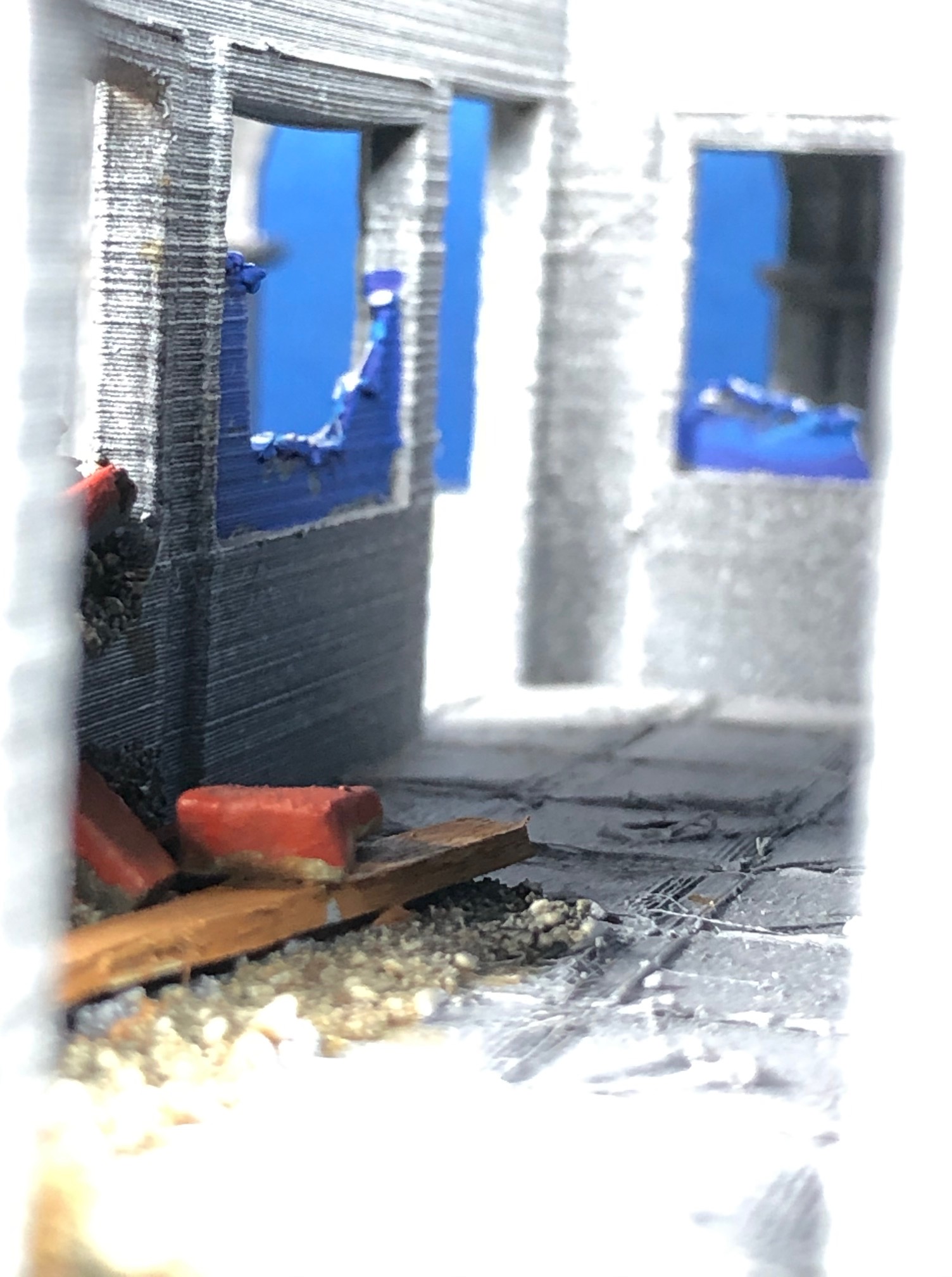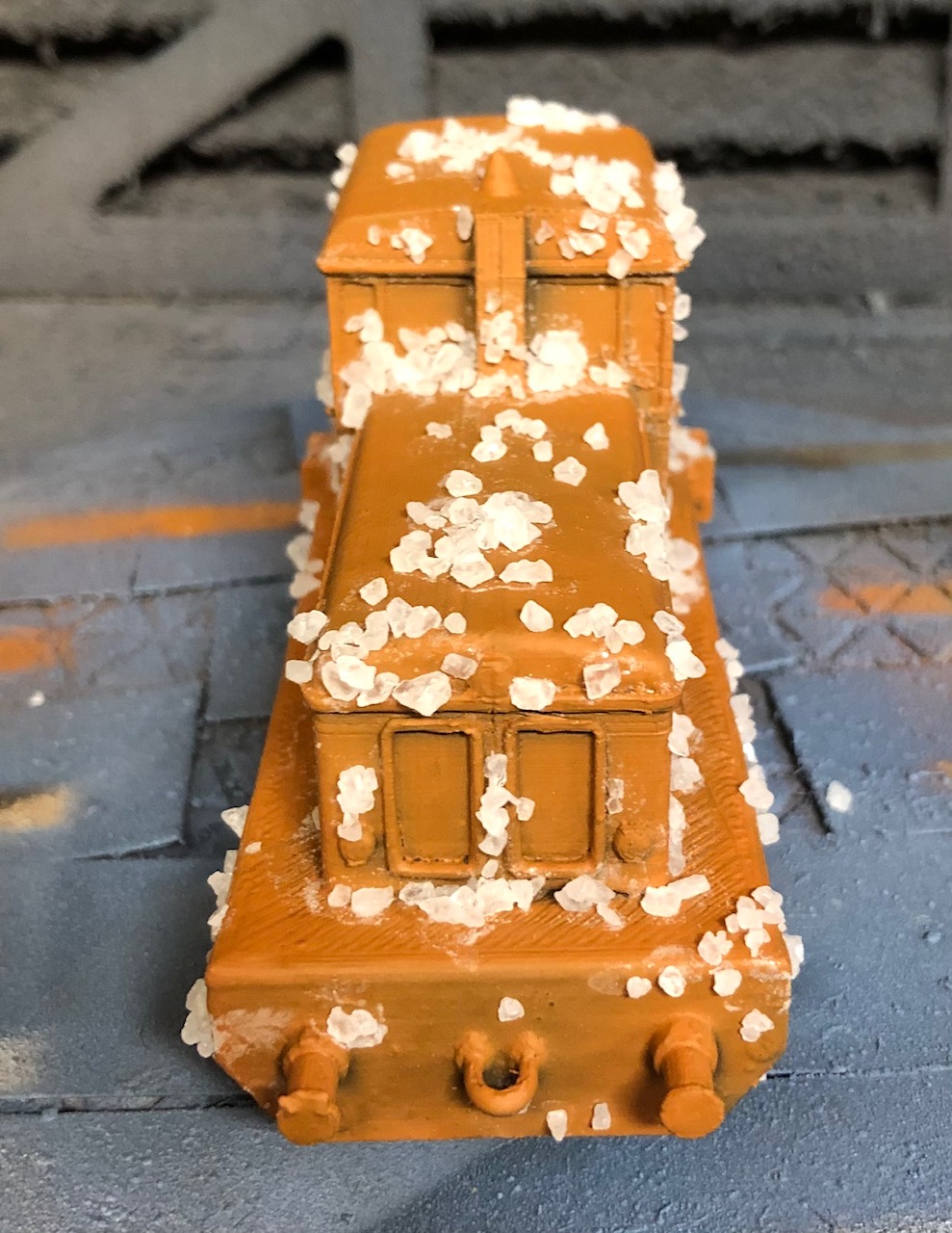 Then I took a coarse brush and brushed of the salt. And with a little water added streaks of rust by rubbing of the color and the hairspray to let the orange brown shine through. After adding details like windows lights etc you get this effect:
