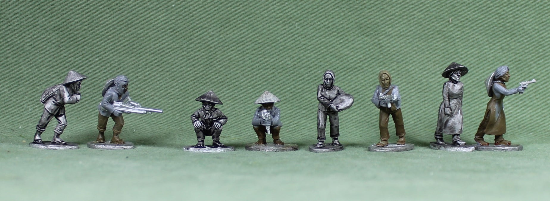 I will paint them up over the next coming weeks . Paul Hicks sculpted the same miniatures with weapons! So you can swop miniatures in your games and turn an innocent villager into a VC!