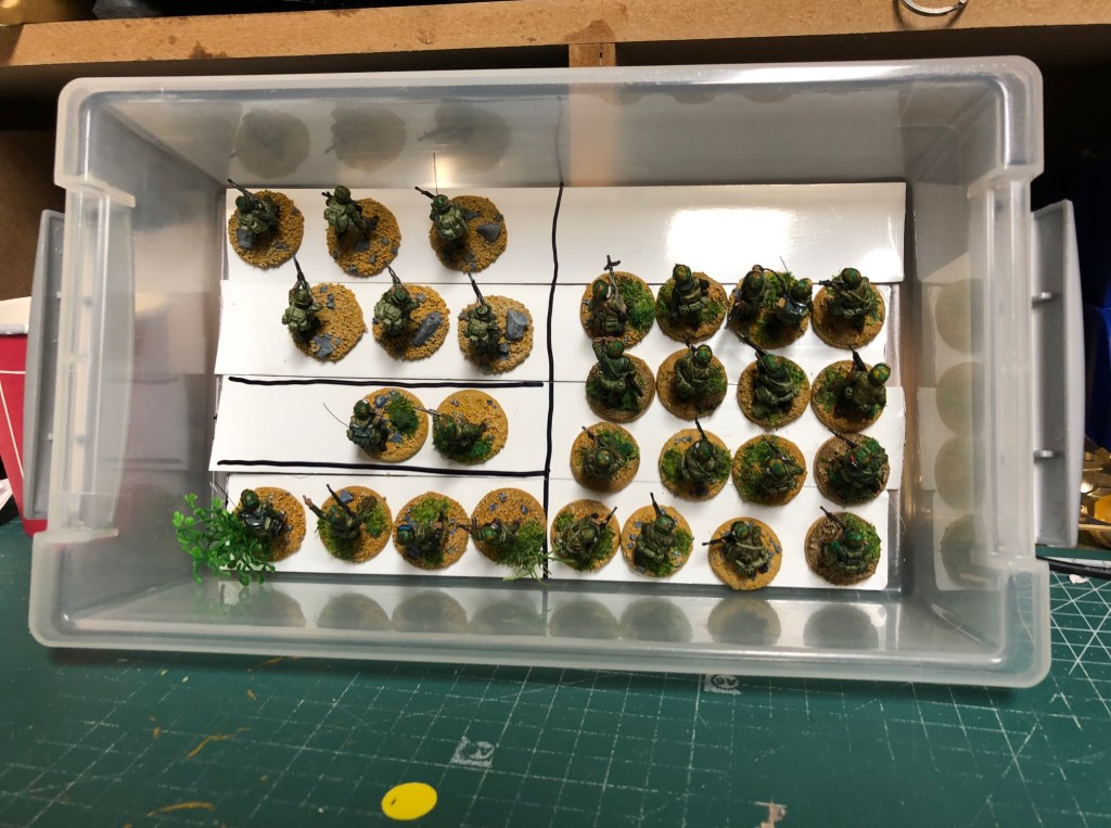 You can even draw lines onto the steel tape to differentiate different units in the box. The Bond between the box and the figures is so strong that you can even turn it upside down. The figures in the picture are metal miniatures so are quite heavy.
