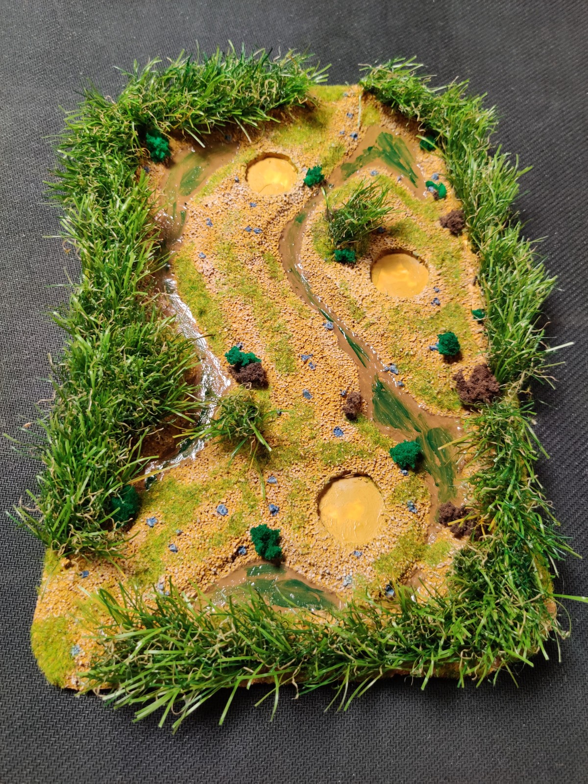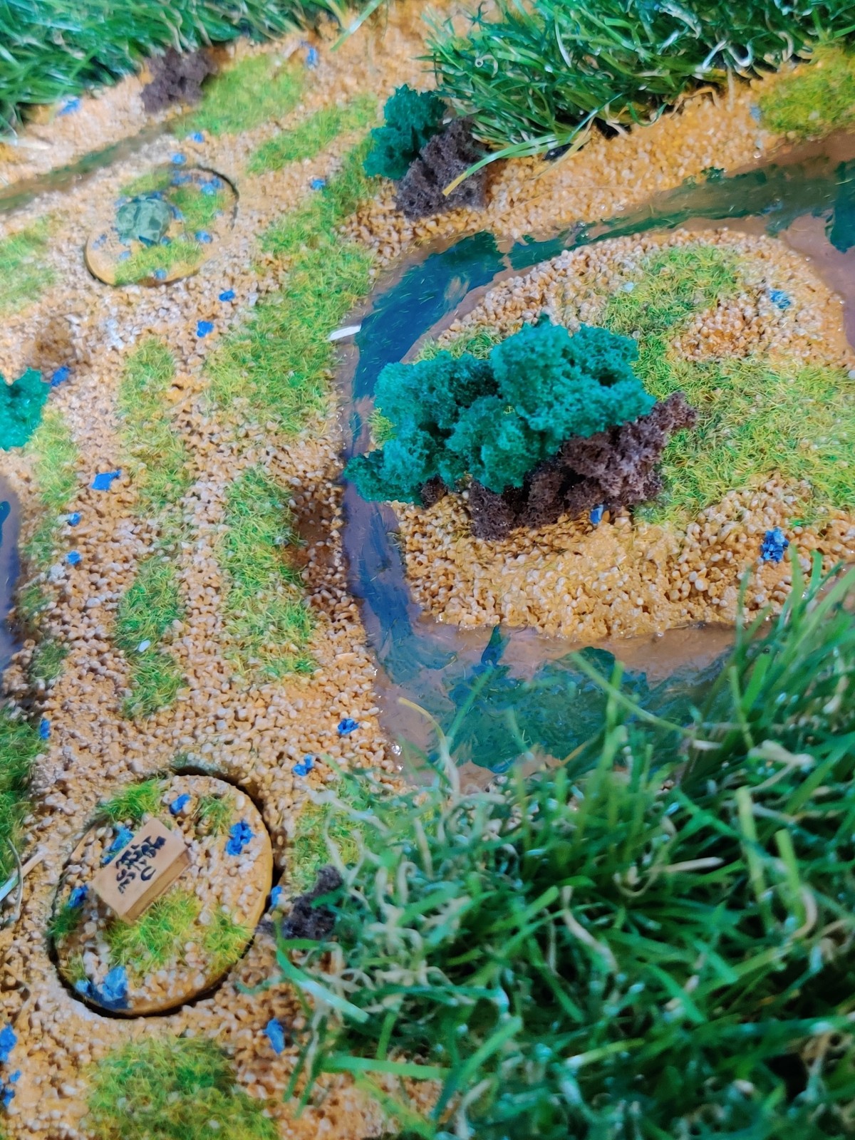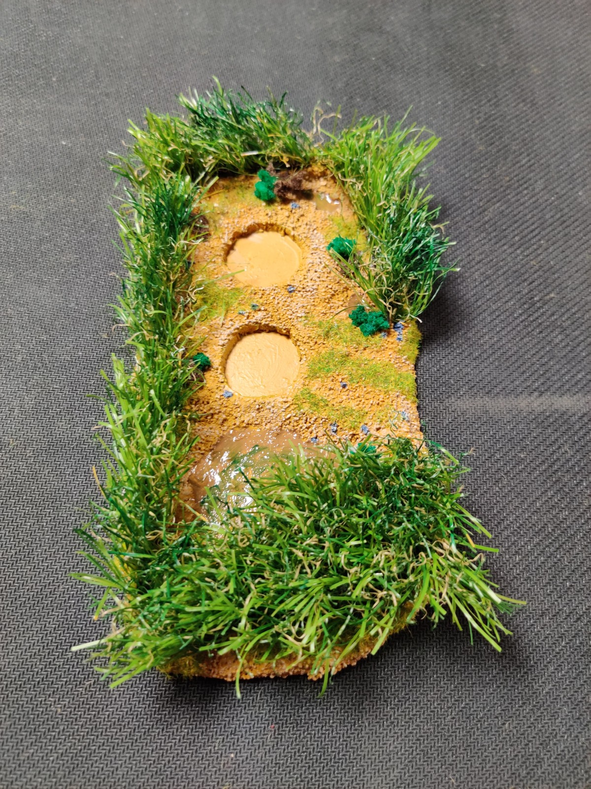 Above you see the 6 bases I did. You can clearly sea the spaces were the traps would go. The elefant grass is artificial lawn cut in strips and glued to the board. Below are the finished bases without traps: