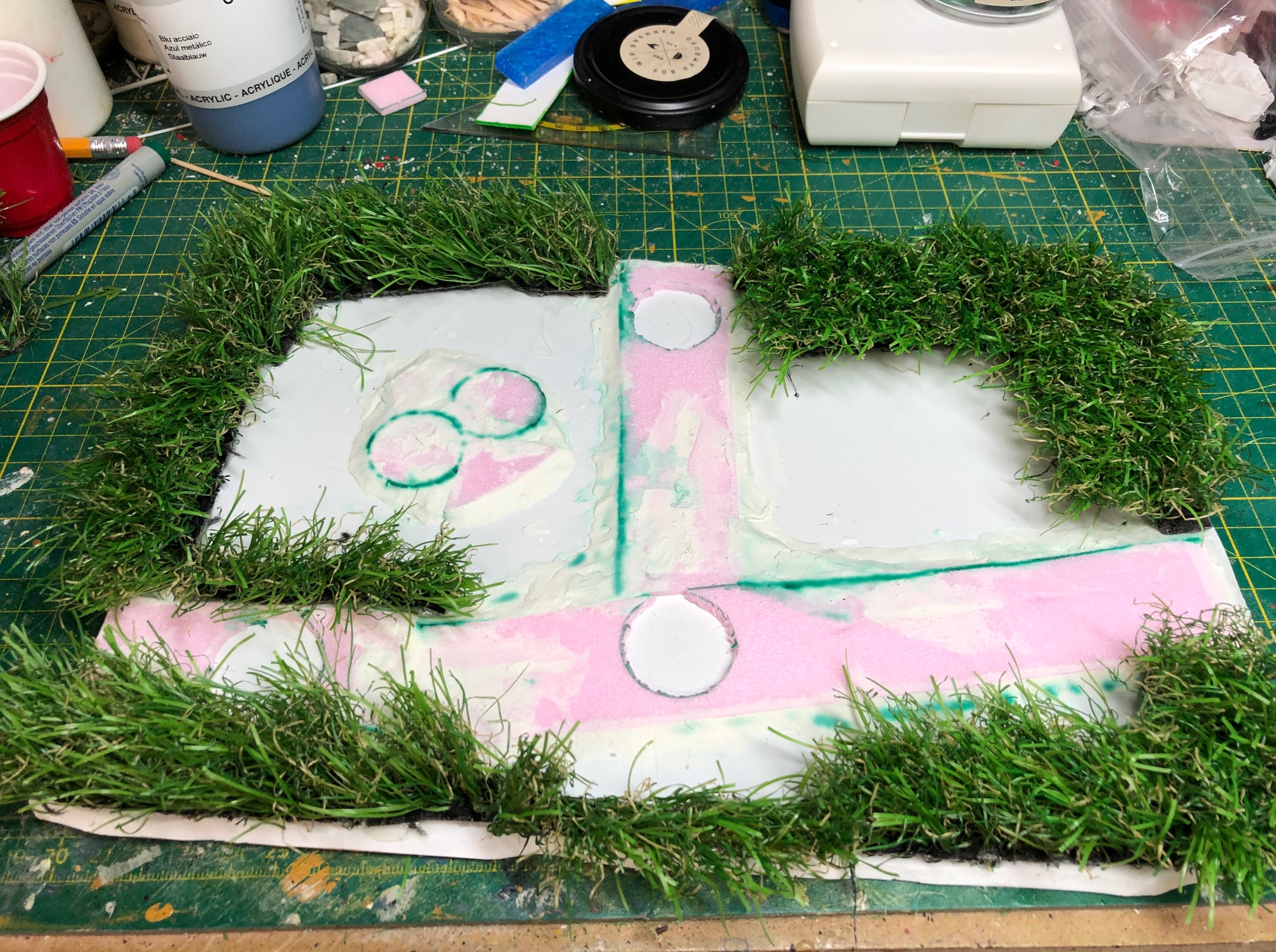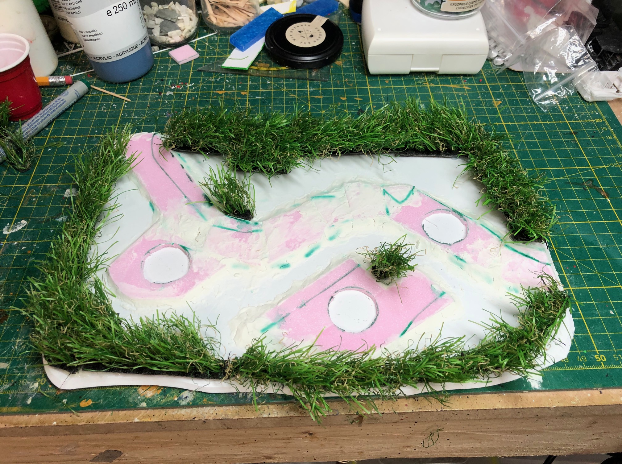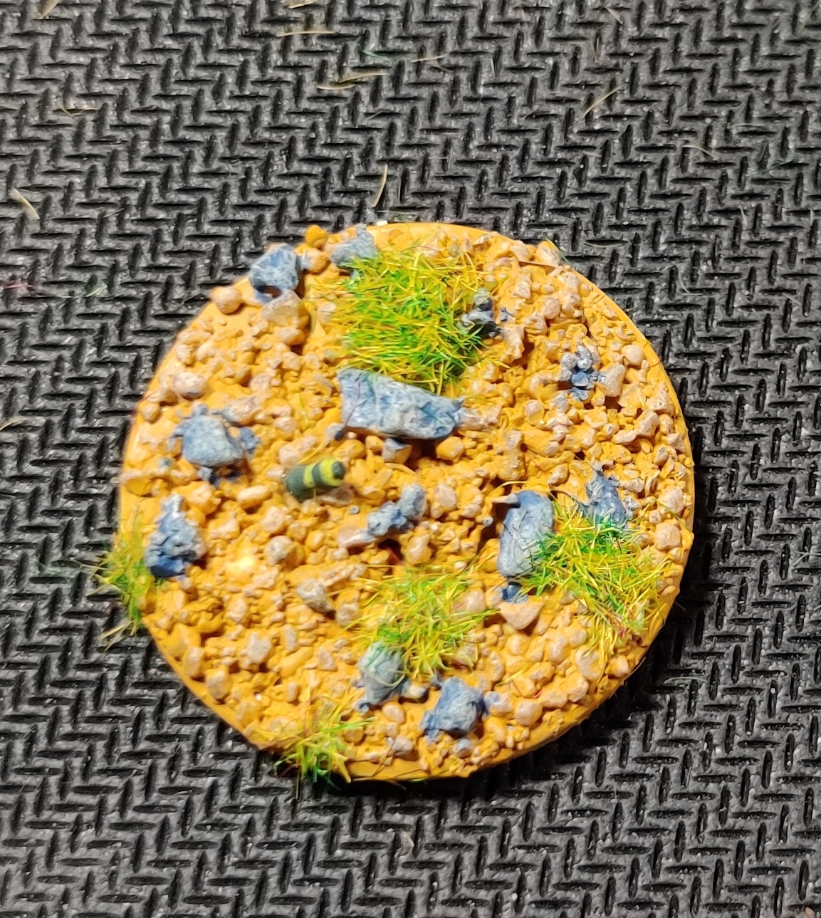 Above you see the 6 bases I did. You can clearly sea the spaces were the traps would go. The elefant grass is artificial lawn cut in strips and glued to the board. Below are the finished bases without traps: