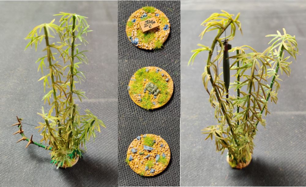 So how did I start. The idea was to build a swampy, elefantgrass overgrown, area, wich is infested with booby traps. The concept was to be able to swap traps with harmless terrain features so no one knows in advance what might happen when the troops walk through the area.