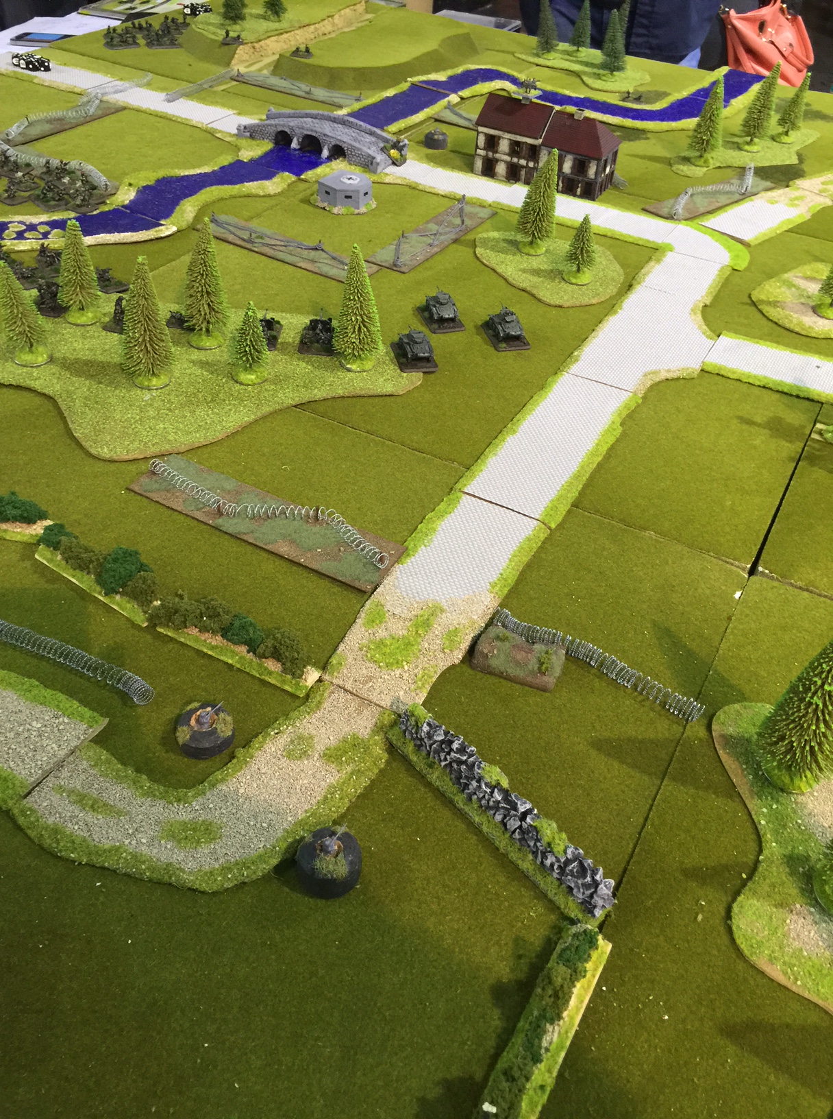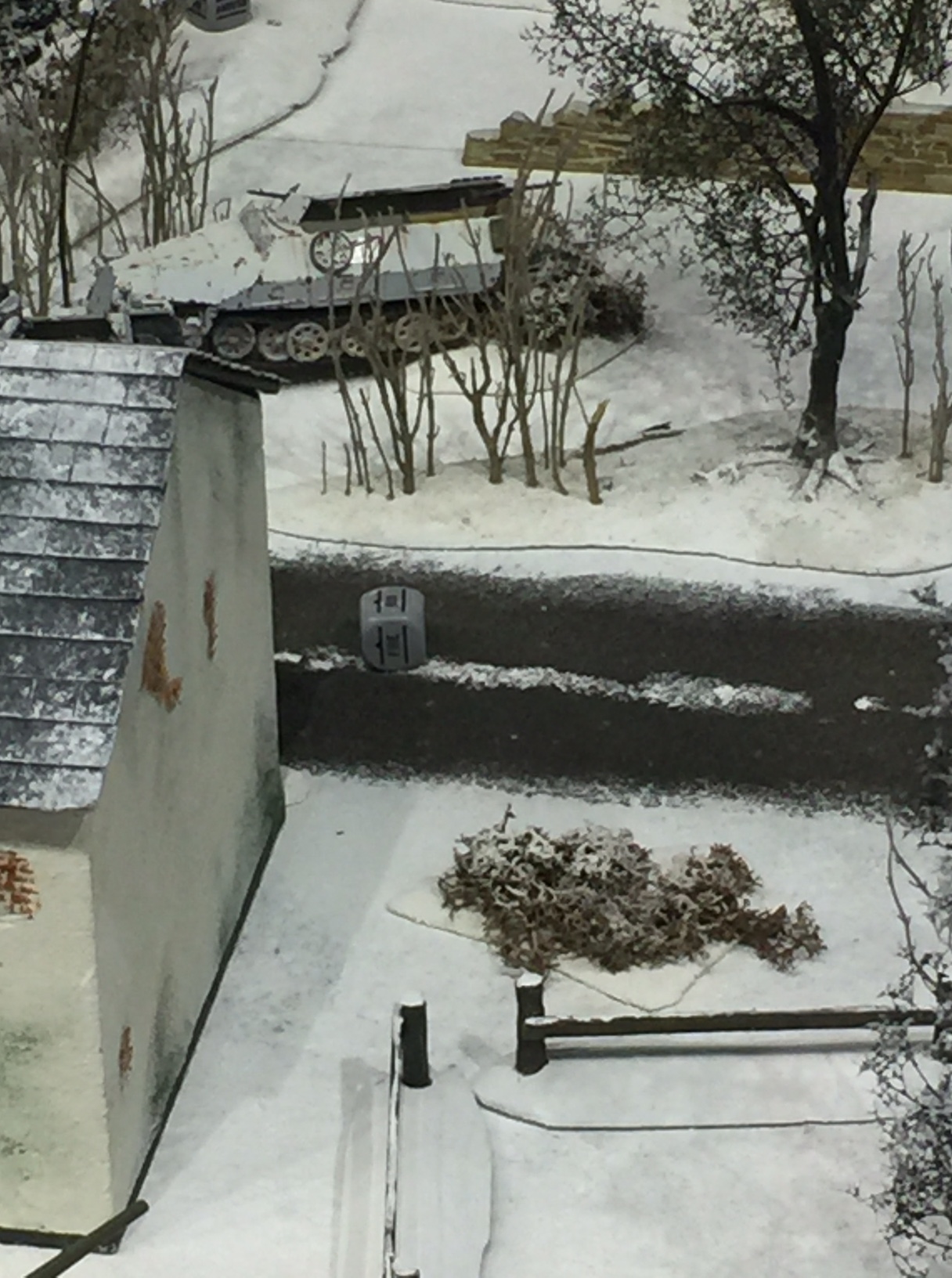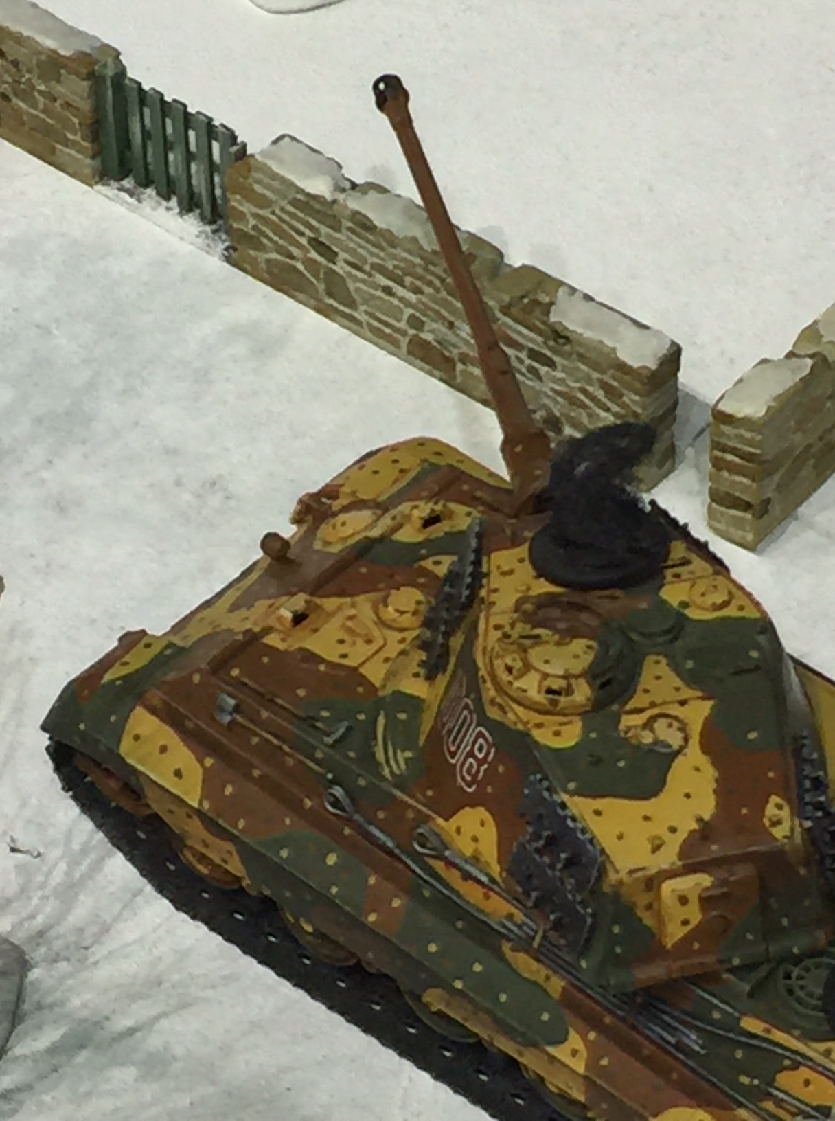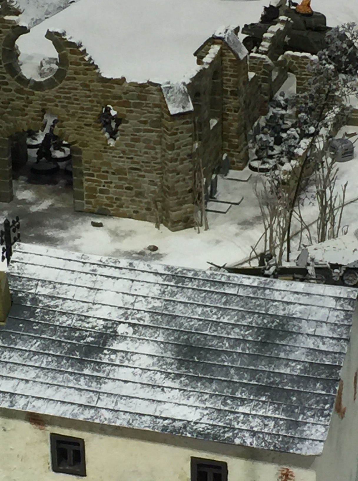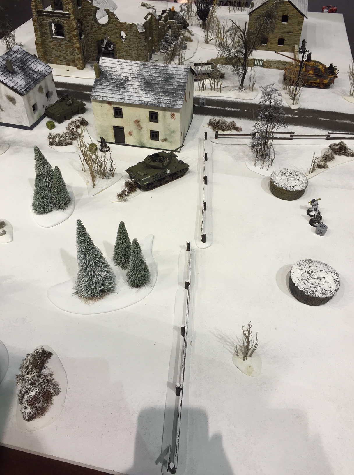 It is a game set during the battle of the Bulge . Wonderful winter terrain and very very good painted figures: